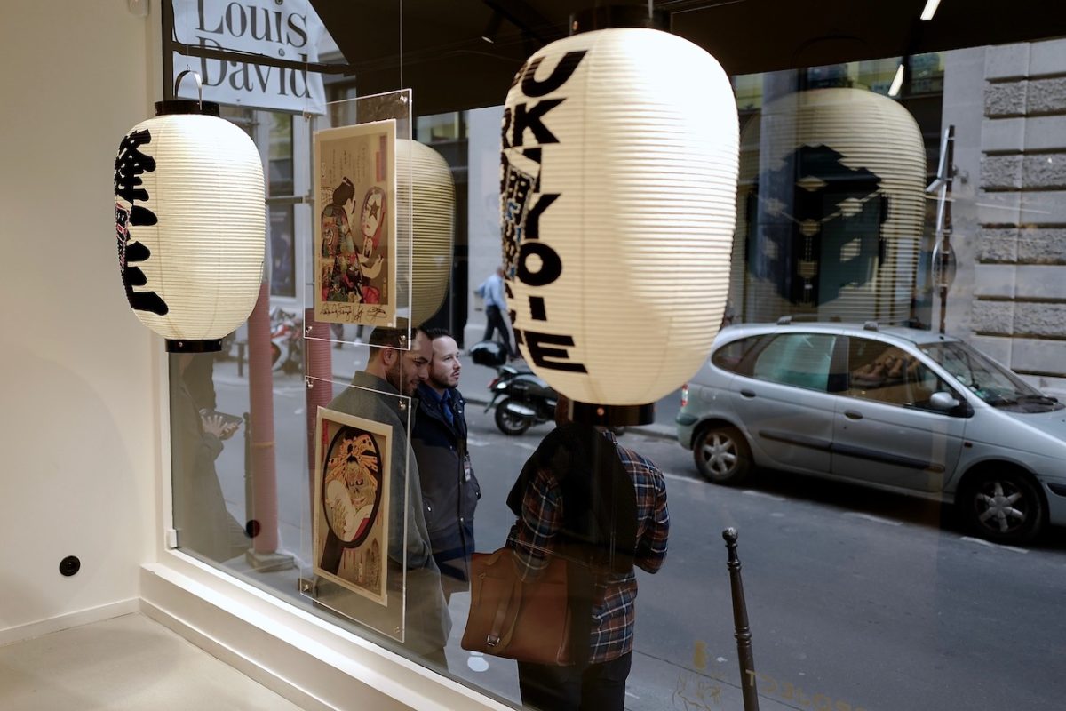 そろそろ始まるレセプション。店内の浮世絵・グッズ、そしてケータリングの準備も出来て、ポツポツと来客が。パリで浮世絵って招待客の動向が気になる。