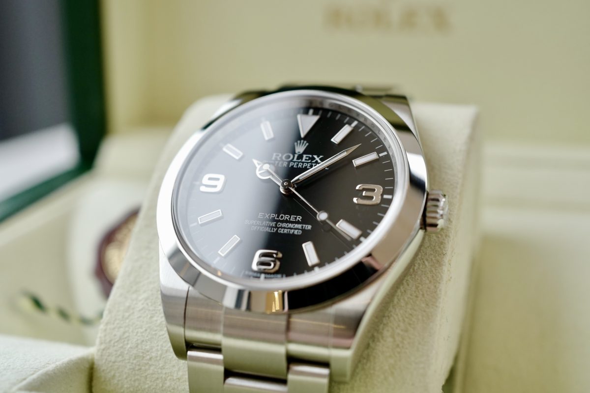 ここ最近、エクスプローラー1の214270でもブラックアウトという表現がチラホラと出てくる様になりましたね。皆さんご存知かとは思いますが、ブラックアウトとは、文字盤の3・6・9のプレートがシルバーだけの物を意味します。現行は3・6・9のシルバーの枠に夜光塗料が入っています。