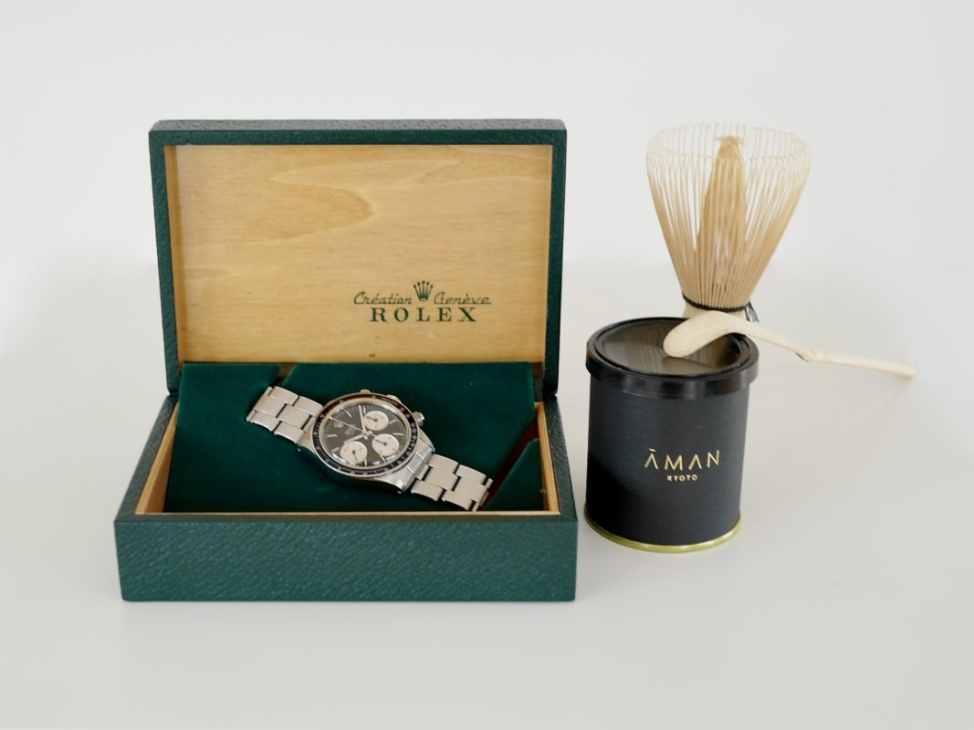 ロレックスを代表するデイトナと茶筅・茶杓、茶碗・掛け軸。いずれも今も変わる事なく愛され使われているという事実。素材も一緒、用途も、所作も、もちろんデザインも。素直にすごいと思う。