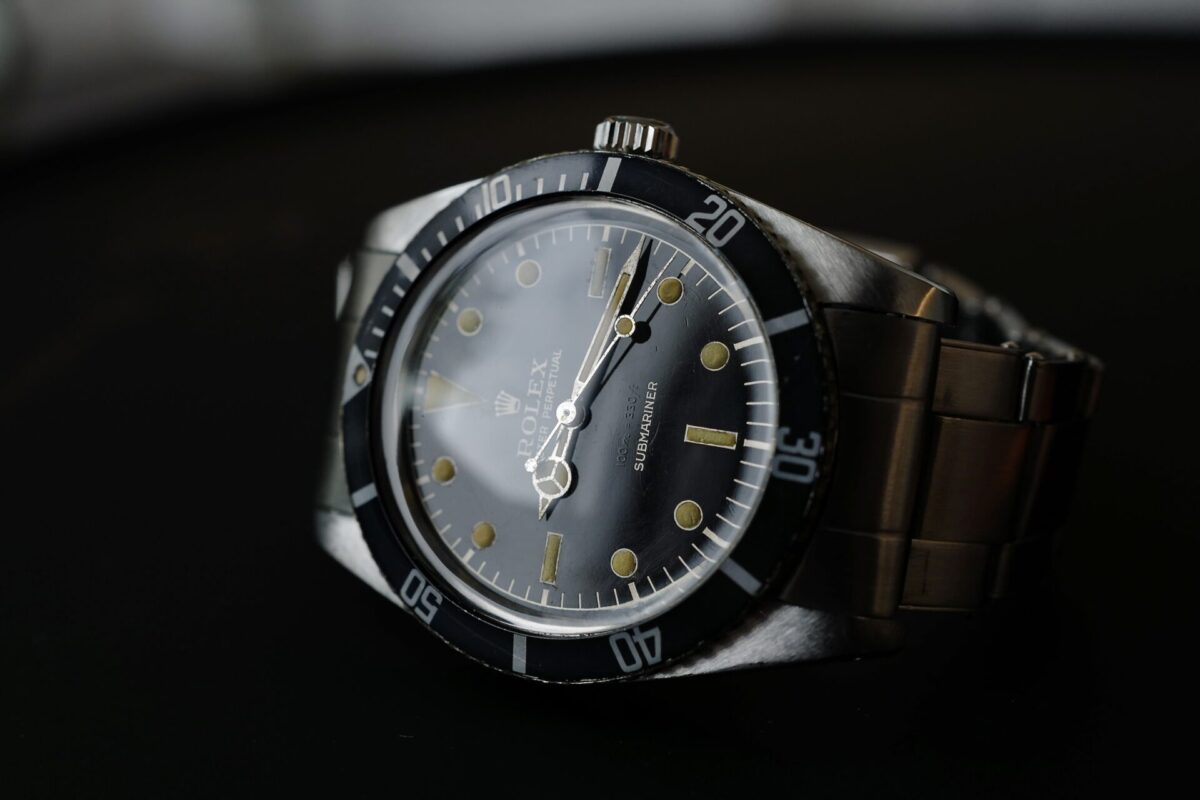 これは、どう見たってときめくでしょう。リューズガード無し、ピカピカのミラー、抜群のケースコンディションとベゼル、そして皆さんお気付きになられました?そうです、潜水表記100m=330ftの文字がSUBMARINERの上に無い?(下の画像をご覧ください!)