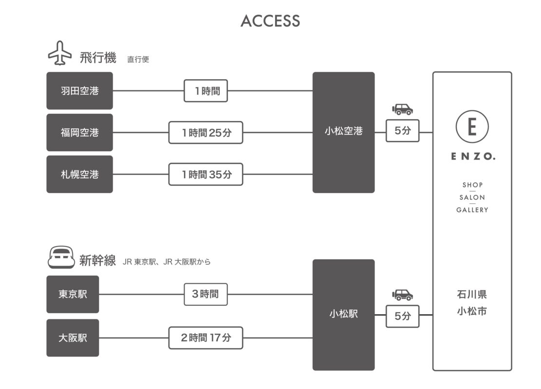 ENZO SHOPの実店舗は北陸三県の一つ、石川県の小松市にあります。小松空港から車で5分ほどの距離なので、都心からお越しの場合も、移動時間にして「約1時間半程度」になります。