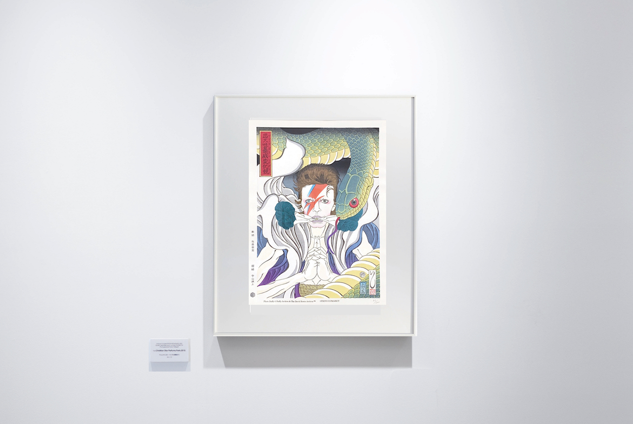 浮世絵の題材でしばしば用いられる鬼童丸は、鎌倉時代の説話集「古今著聞集」や曲亭馬琴の「四天王剿盗異録」等に登場する妖術使い。本図は、大蛇を操る荒々しい鬼童丸と、繊細で神秘的な魅力を放つボウイのイメージを掛け合わせて表現しました。