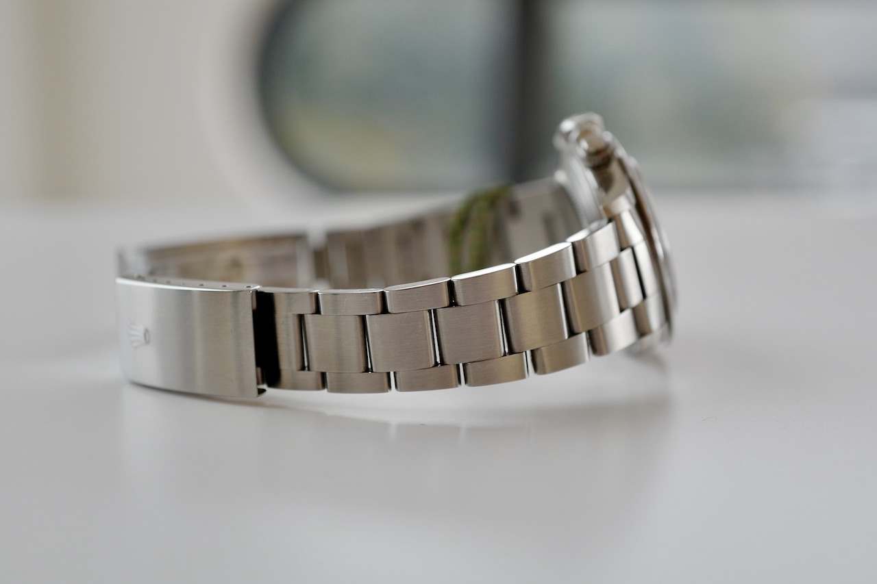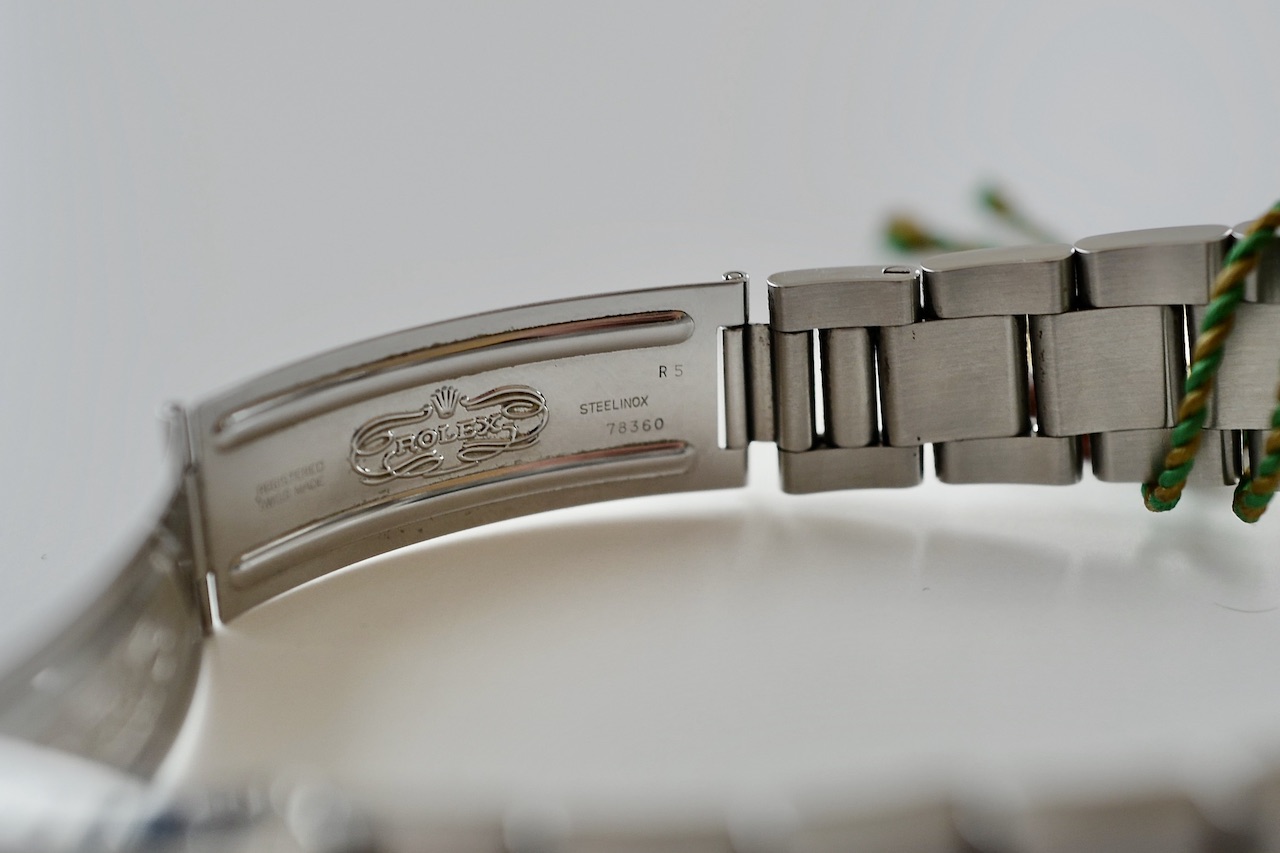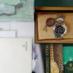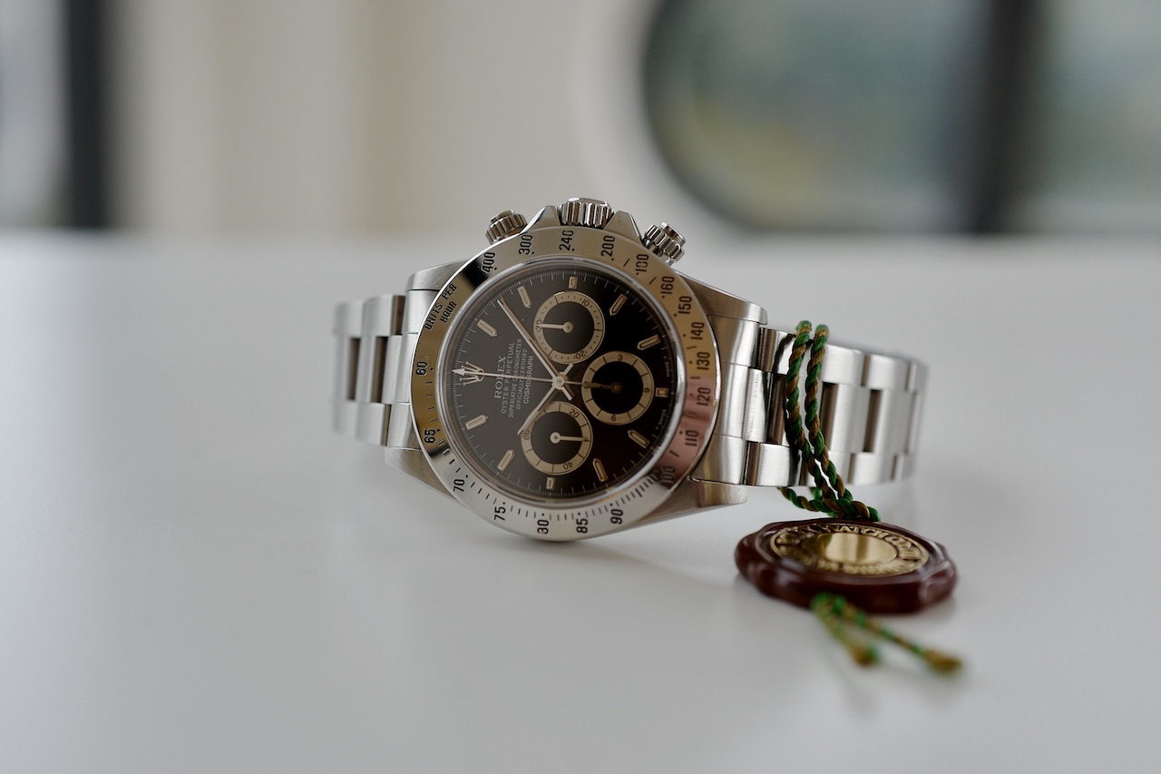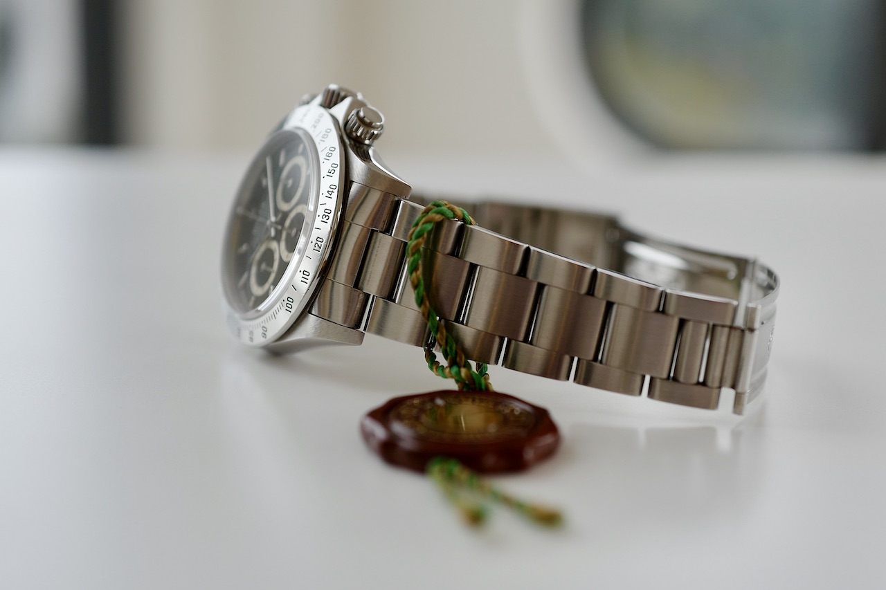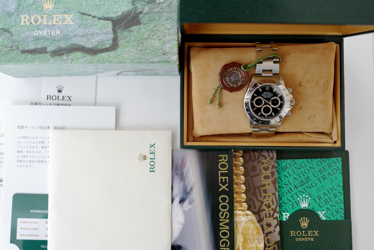 最近特に見つかりにくくなったデイトナ16520の逆6のシングルバックル。ダイヤルはマーク4。そしてベゼルもマーク4。すっきりとした印象のロレックスオーバーホール済み(最終2016年)の優良個体です。