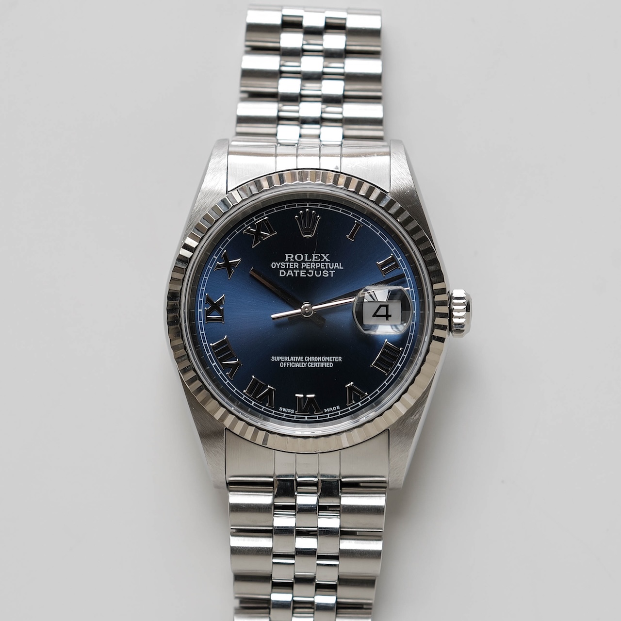 ロレックス/デイトジャスト16234/ブルーローマン/ 18Kホワイトゴールドベゼル/箱・保証書付き/ROLEX DATE-JUST REF.16234 “BLUE ROMAN” 18KWG bezel with Box and Paper 2001y