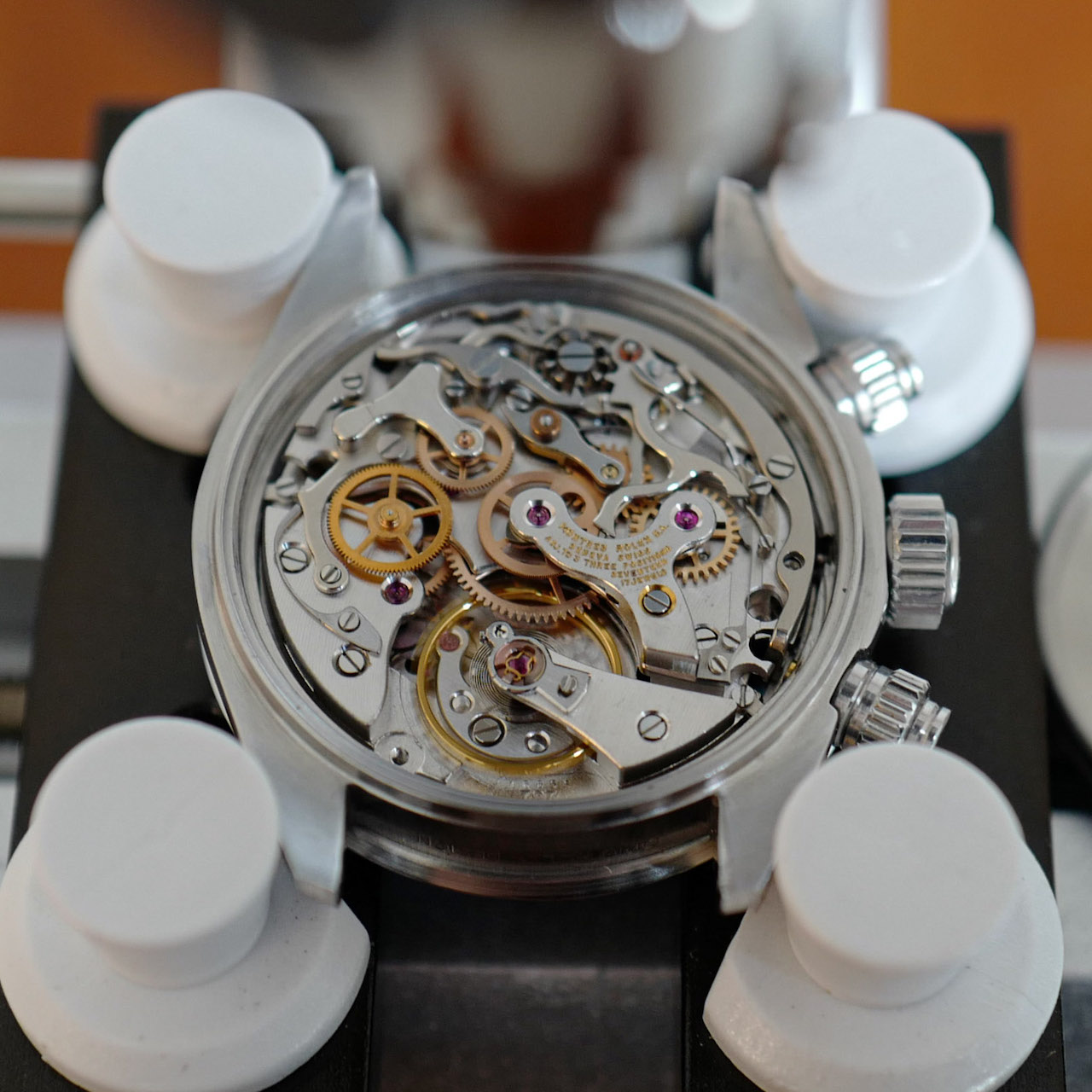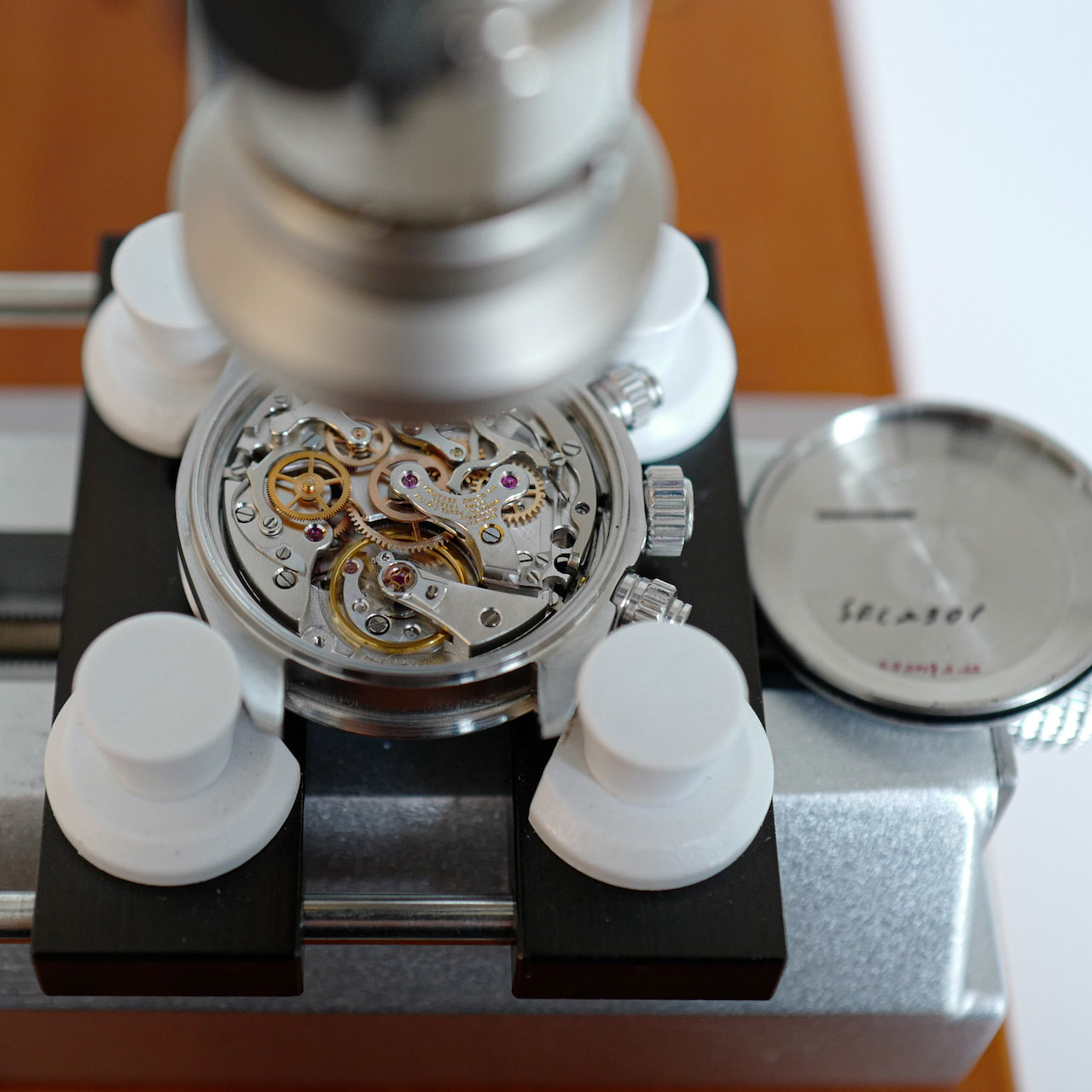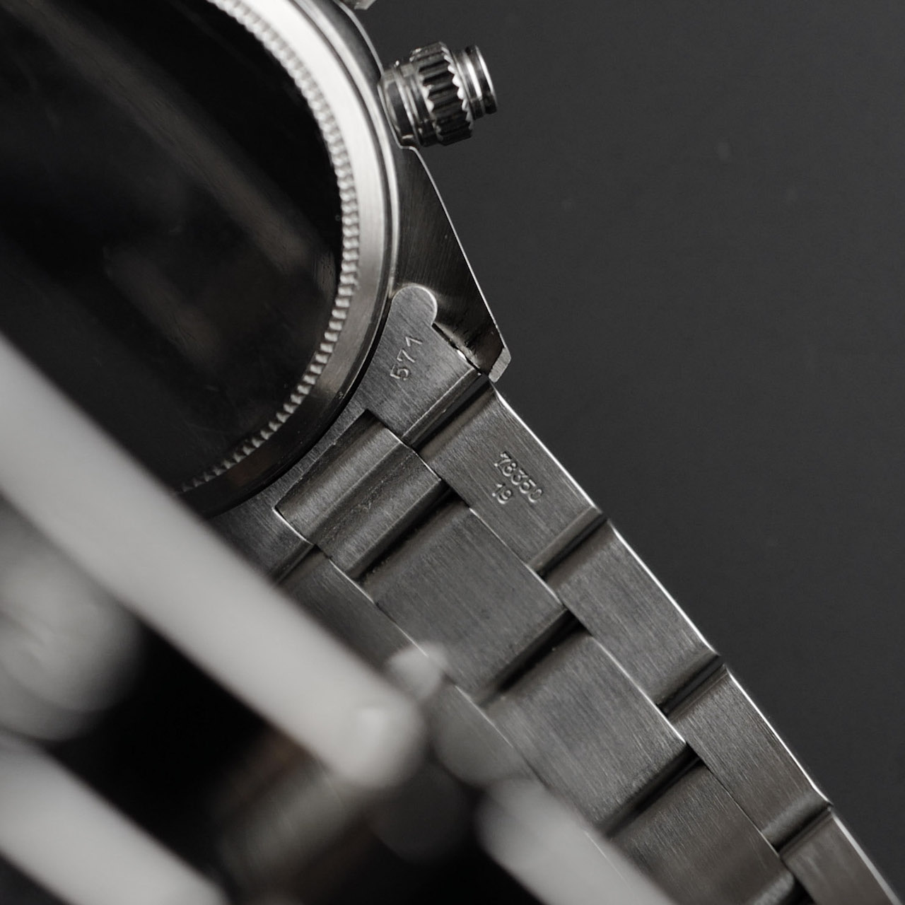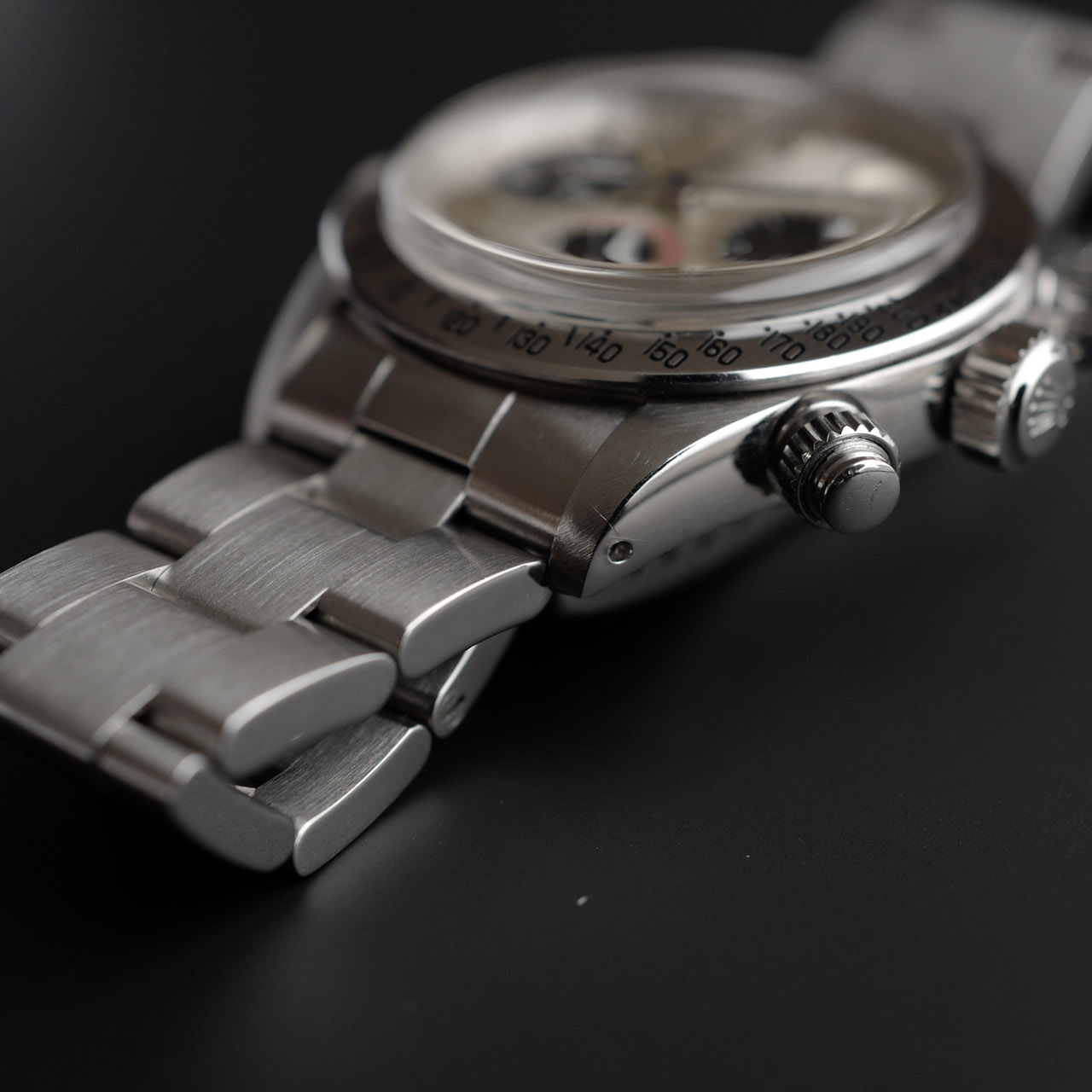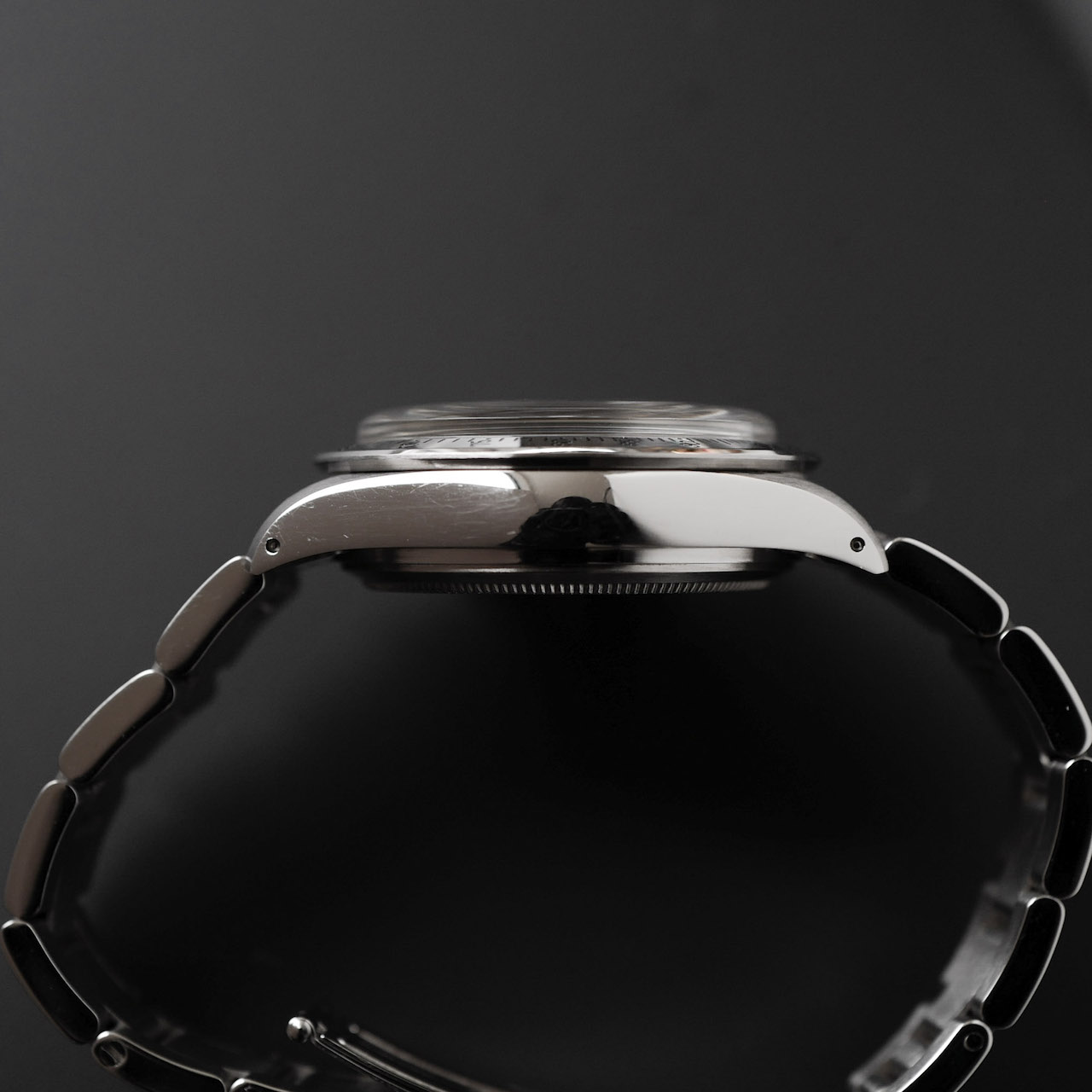 ベゼルはマーク3で、ノンポリッシュと思われます。ケースもノンポリッシュかそれに限りなく近い抜群のコンディションです。プッシャーがOH時にマーク3に交換されています。