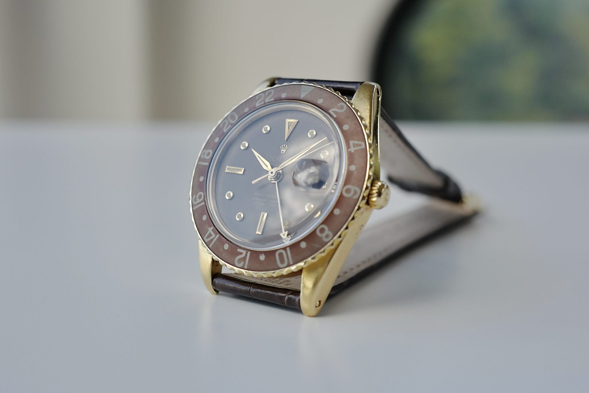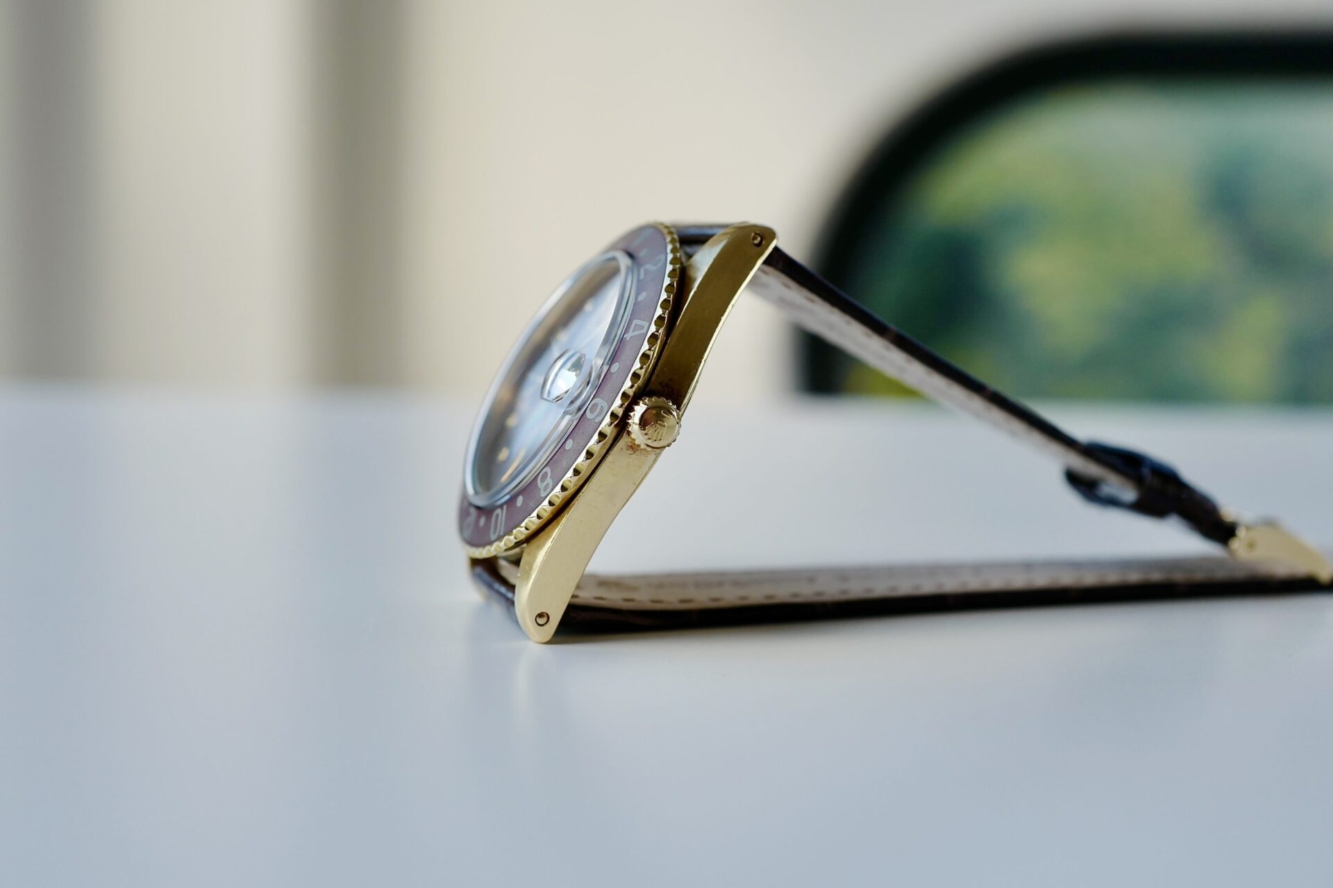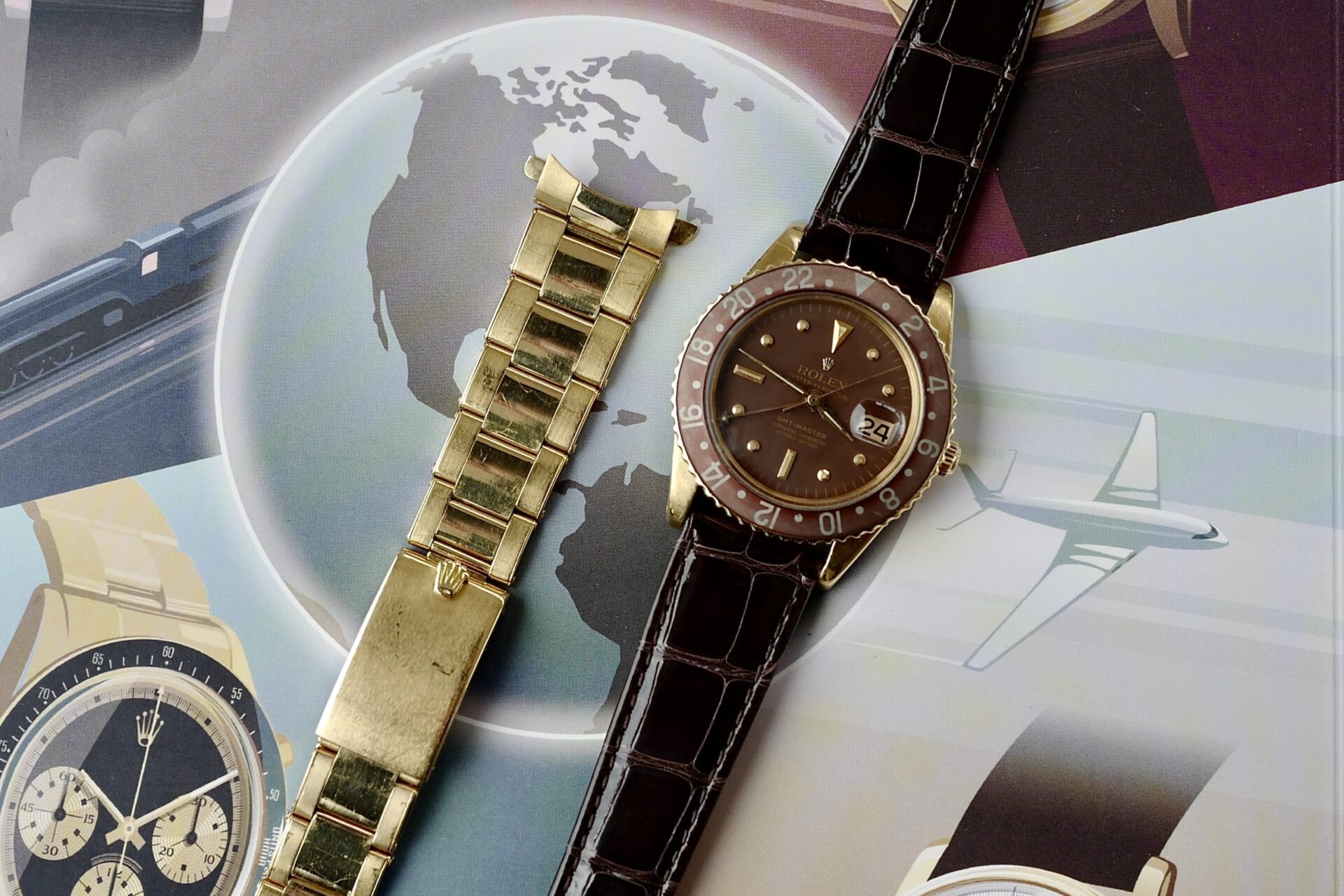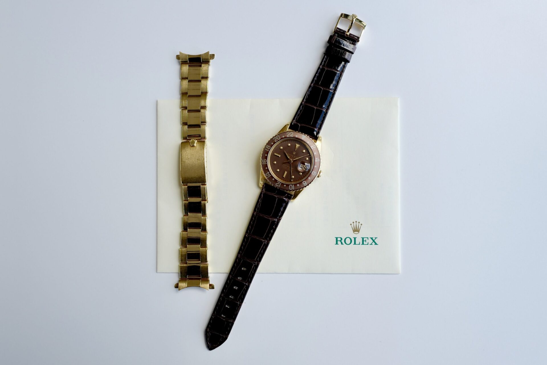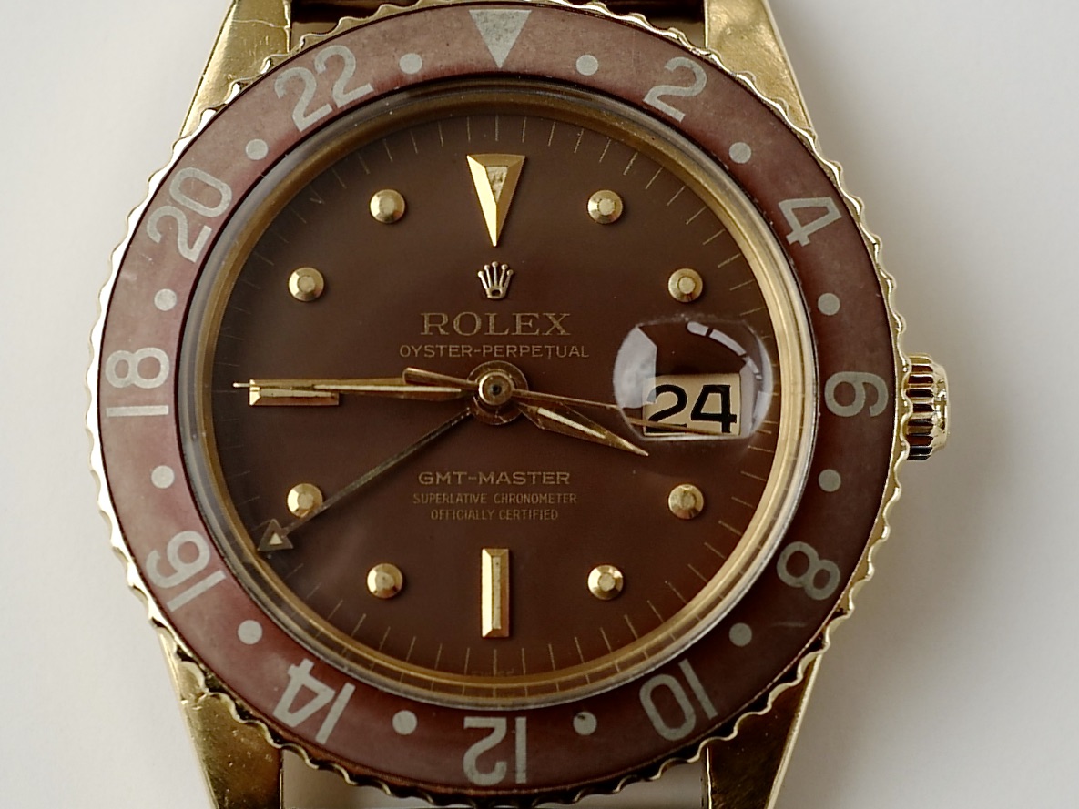 非常に希少な1675/8のリューズガード無しのモデル。この1675の金無垢ガード無しを仕入れるにあたり、様々な資料及びオークションのリザルト、ディテールと価値等の分析を行いました。